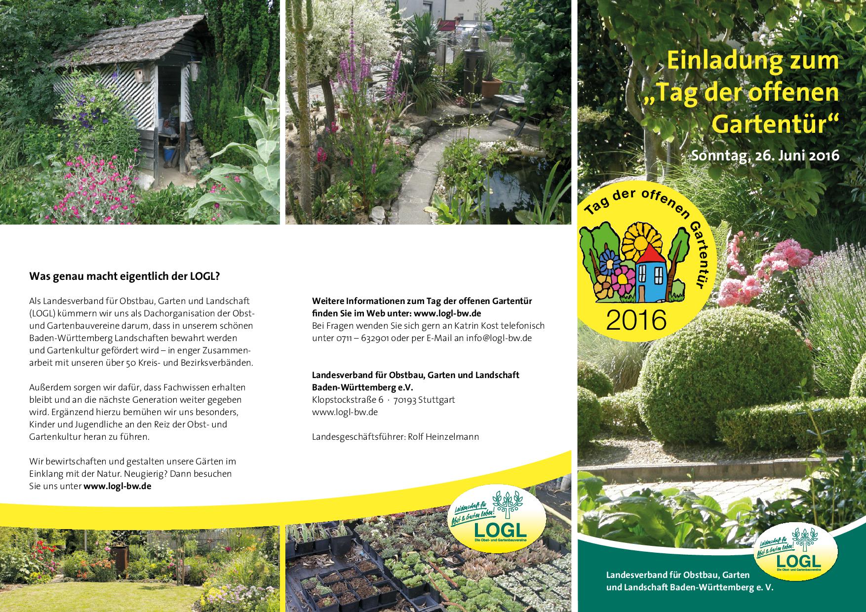 Träger des Tags der offenen Gartentür ist der Landesverband für Obstbau, Garten und Landschaft Baden-Württemberg e.V. (LOGL) mit Sitz in Stuttgart. Er ist der Dachverband der Obst- und Gartenbauvereine sowie der verbindenden Kreis- und Bezirksverbände in Baden-Württemberg. Der LOGL setzt sich für die Förderung einer vielfältigen Gartenkultur, den Erhalt und die Pflege von Streuobstwiesen ein und möchte die Begeisterung von Kindern und Jugendlichen für Themen der Obst- und Gartenkultur wecken, Fachwissen erhalten und Fachwissen weiter geben.